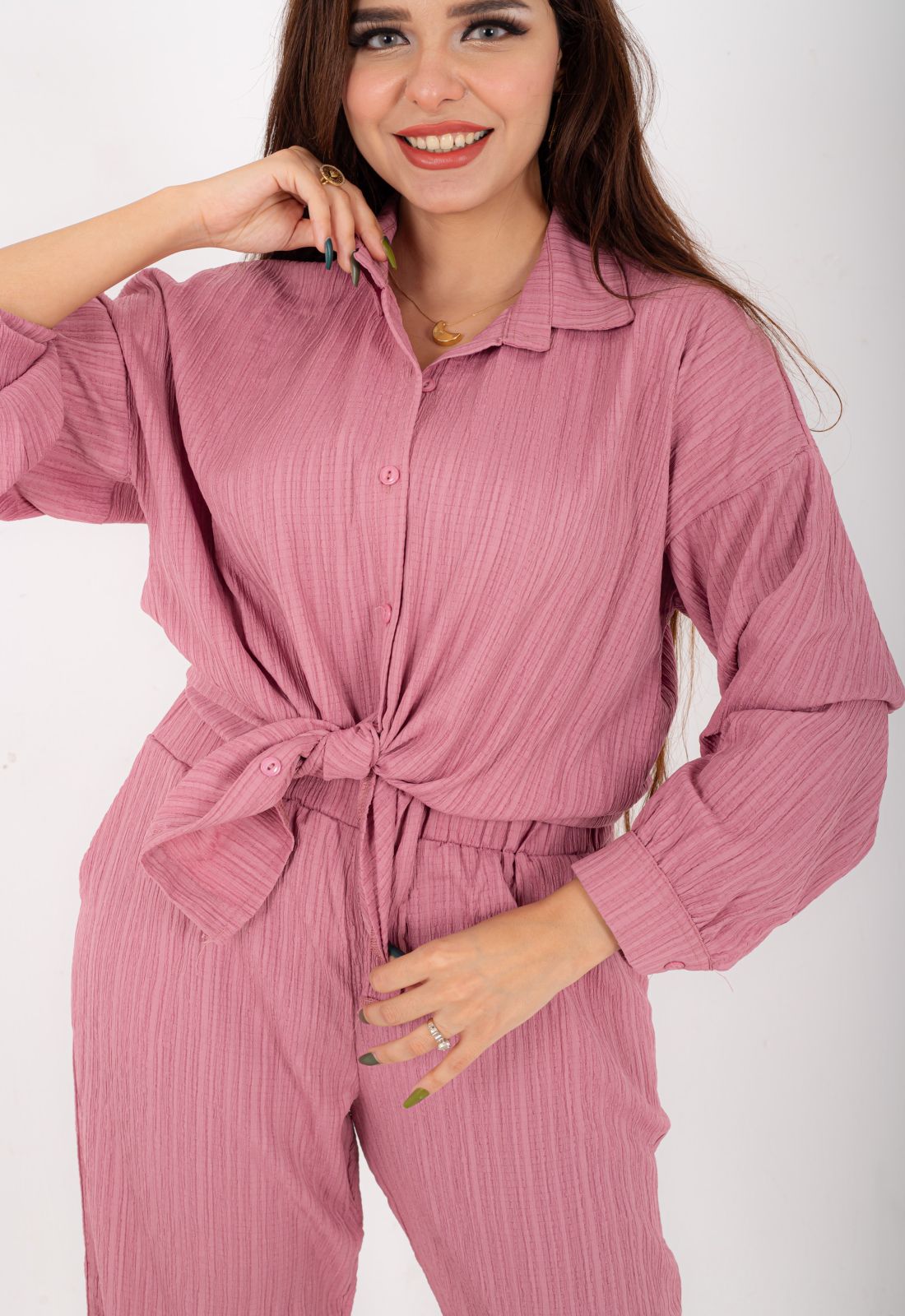 يتكوّن من بليزر واسع بستايل كاجوال، مع بنطلون واسع ومريح، ليجمع بين الأناقة والعملية في كل تفاصيله.